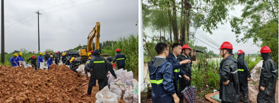 在潼湖崗頭新圍,8月5日早上,水電公司接到赴潼湖崗頭新圍搶險(xiǎn)命令,搶險(xiǎn)隊(duì)70人立即集結(jié)待命,完成應(yīng)急搶險(xiǎn)安全技術(shù)交底工作后乘車前往仲愷高新區(qū)潼湖崗頭新圍開展子堤加高加固搶險(xiǎn)。水電公司總工程師謝武帶隊(duì)趕赴險(xiǎn)情現(xiàn)場勘查,研討搶險(xiǎn)方案,指導(dǎo)搶險(xiǎn)工作。12時(shí)30分,搶險(xiǎn)人員、機(jī)械設(shè)備和搶險(xiǎn)物資已到達(dá)現(xiàn)場第一作業(yè)點(diǎn)開展搶險(xiǎn)。因連日降雨,現(xiàn)場河水水位高漲幾近漫堤,險(xiǎn)情非常緊急。搶險(xiǎn)隊(duì)員或鏟裝沙袋、或搬運(yùn)堆砌、或機(jī)械清障,大家分工協(xié)作,有條不紊開展子堤加高。經(jīng)過全員不懈努力,僅用4個(gè)小時(shí),第一搶險(xiǎn)點(diǎn)子堤加高加固就已完成,順利完成搶險(xiǎn)任務(wù)。