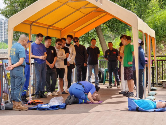 藍(lán)天救援隊(duì)結(jié)合近期發(fā)生的溺水和救援案例,現(xiàn)場(chǎng)拆解“黃金四分鐘”,他們帶領(lǐng)景區(qū)和經(jīng)營(yíng)業(yè)態(tài)工作人員分組練習(xí),從清理呼吸道、開(kāi)放氣道到精準(zhǔn)按壓,逐一糾正手勢(shì)偏差。全域覆蓋從“專業(yè)隊(duì)”到“全員兵”的安全共識(shí)。接著,槳板運(yùn)動(dòng)協(xié)會(huì)與藍(lán)天救援隊(duì)分別對(duì)槳板救援、繩包救援、徒手救援等進(jìn)行了系統(tǒng)化的培訓(xùn),景區(qū)內(nèi)各業(yè)態(tài)的工作人員也積極地參與了救援實(shí)踐的學(xué)習(xí)。